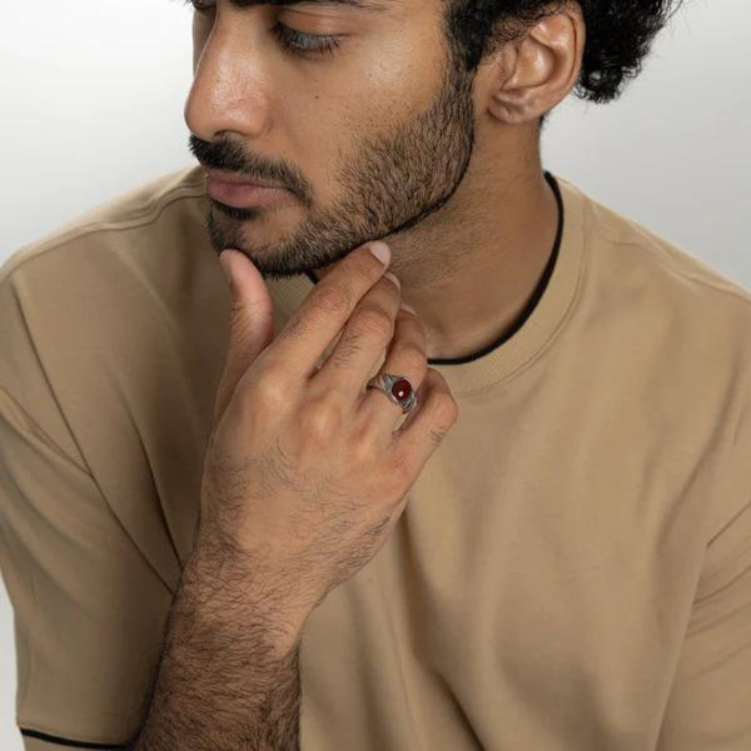 Der brandneue Aqeeq-Ring ist mit einem roten Aqeeq-Stein besetzt und in einen Stahlring eingelegt, inspiriert von vielen Überlieferungen, dass der Prophet Muhammad, Frieden sei mit ihm, häufig einen Ring mit einem Stein trug. Das perfekte Stück, das Ihrer Garderobe etwas traditionelles verleiht.